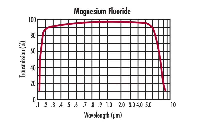 Magnesium Fluoride (MgF2) Windows offer excellent broadband transmission from the deep-UV to the mid-infrared. DUV transmission makes them ideal for use at the Hydrogen Lyman-alpha line and for UV radiation sources and receivers, as well as excimer laser applications. MgF2 is a rugged material resistant to chemical etching, laser damage, and mechanical and thermal shock. It has a Knoop Hardness of 415 and index of refraction of 1.38.
